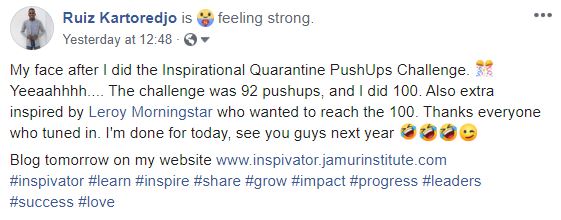 Ik heb in totaal 36 “love” en 20 “like” gehad, wat het brengt op een aantal van 92 pushups. Nog nooit heb ik eerder zoveel pushups gedaan. Klik hier om de Facebook Live te bekijken.