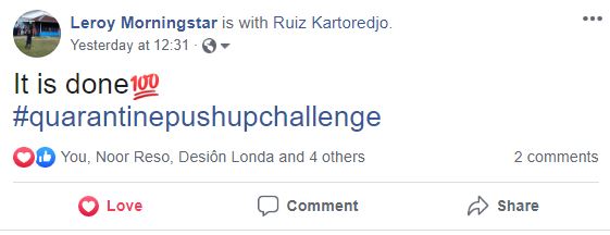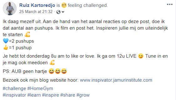 Makkelijk te praten. Moeilijk om te doen! Heel veel mensen die zeggen “start je eigen gym thuis.” Wel, ik zoek al de hele tijd naar momenten om pushups en buikspier oefeningen te doen thuis. Dit heb ik zeker drie jaren laten liggen. Met deze COVID-19 situatie waar wij zoveel als mogelijk thuis moeten zijn, is het raadzaam om hieraan te beginnen. Maar, de drang was er gewoon niet. Totdat ik mezelf uitdaagde middels het plaatsen van een Facebook post: Inspirational Quarantine PushUps Challenge.